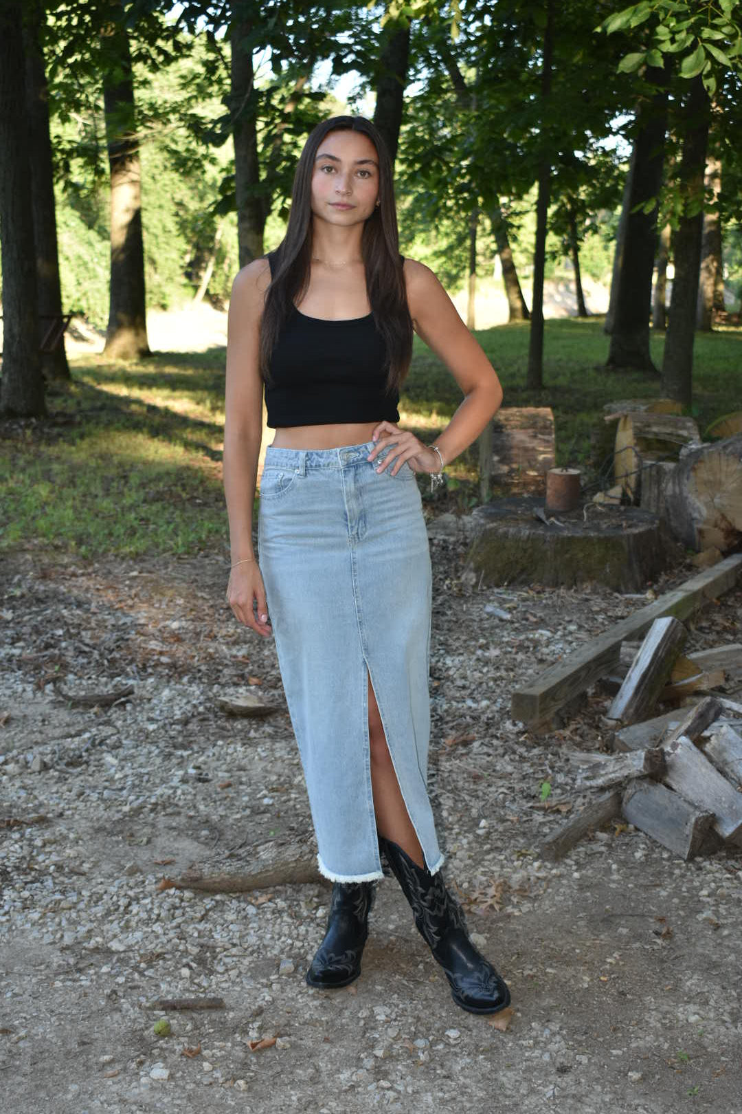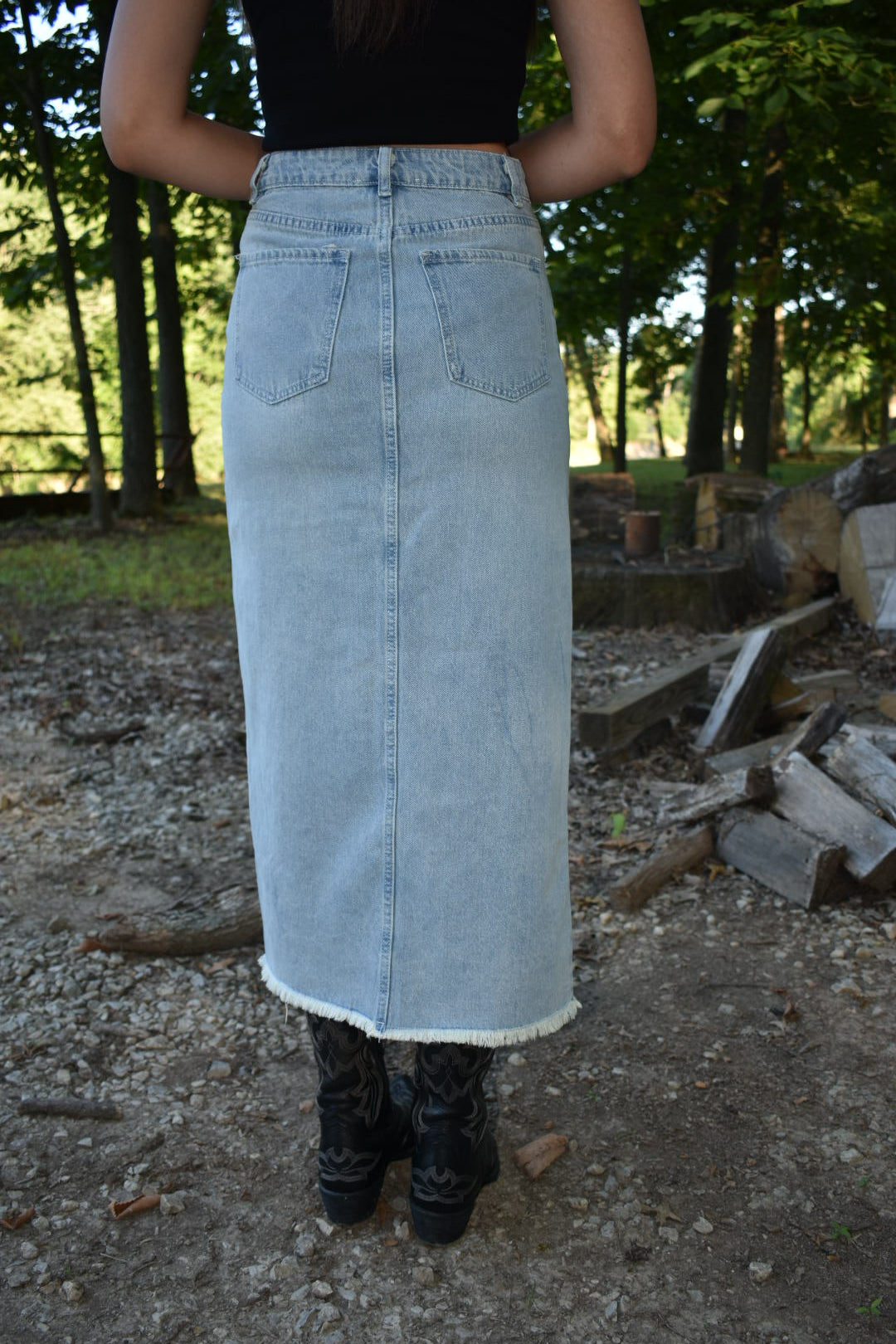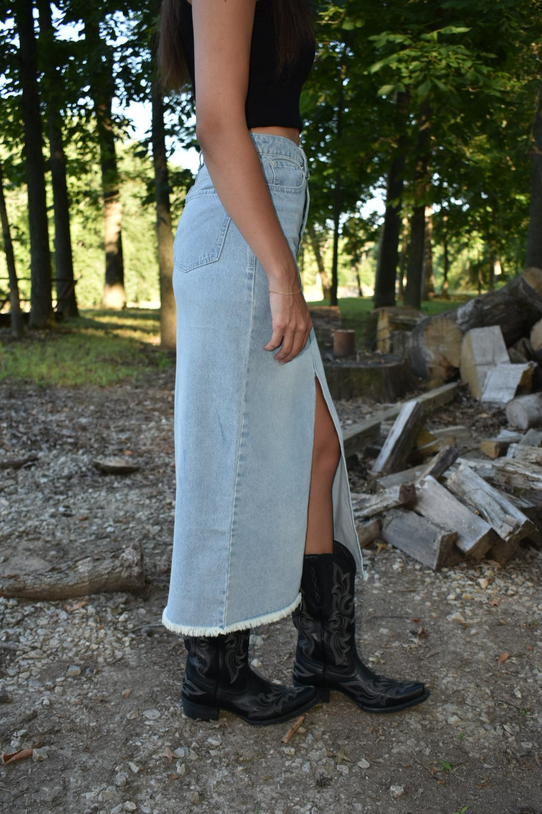 Our “Denim Maxi Skirt” features an H-Line slit, raw hem detailing, and two back pockets.