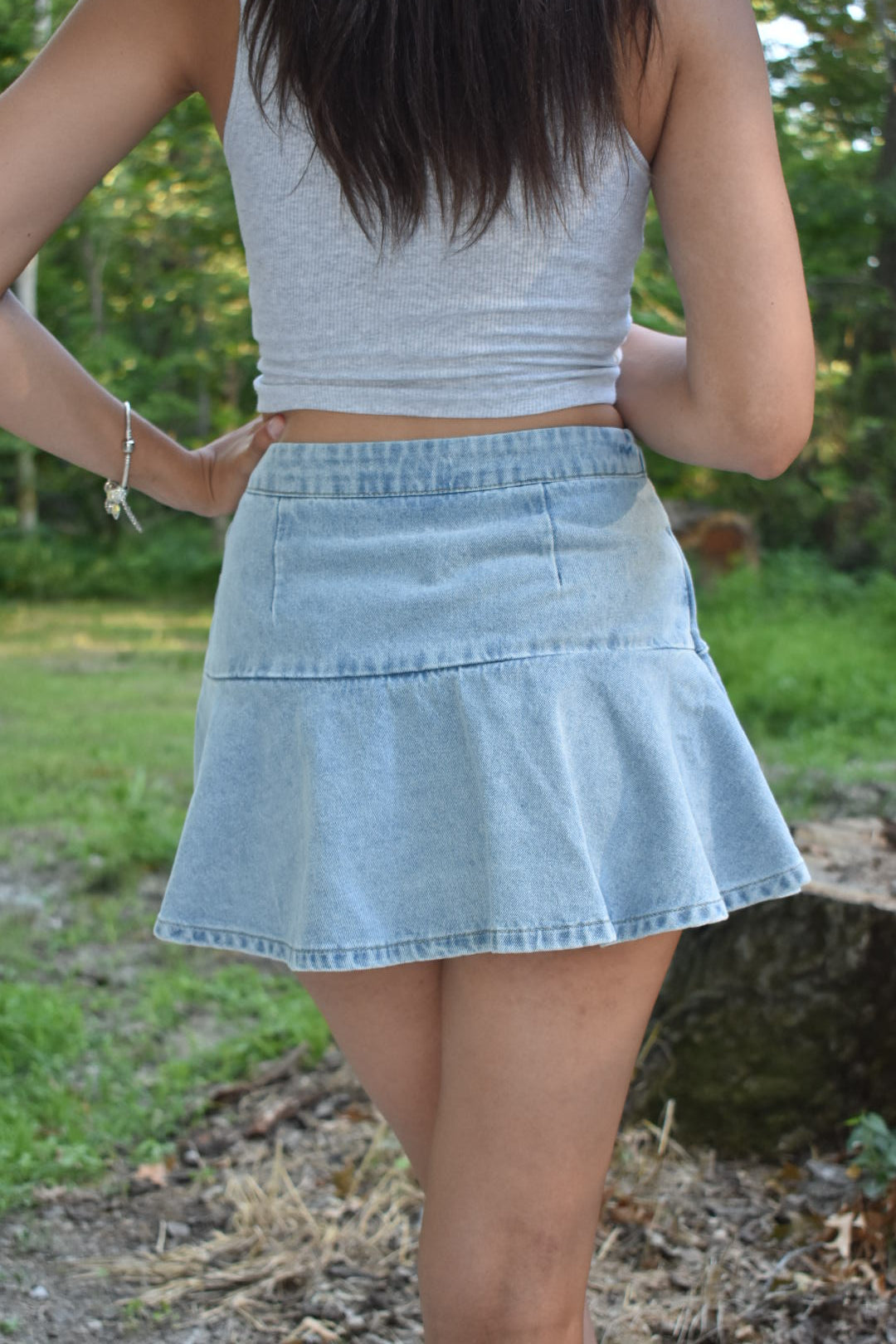 Our “Ruffled Denim Mini Skort” features a wrap front with ruffled detailing and a side zipper.