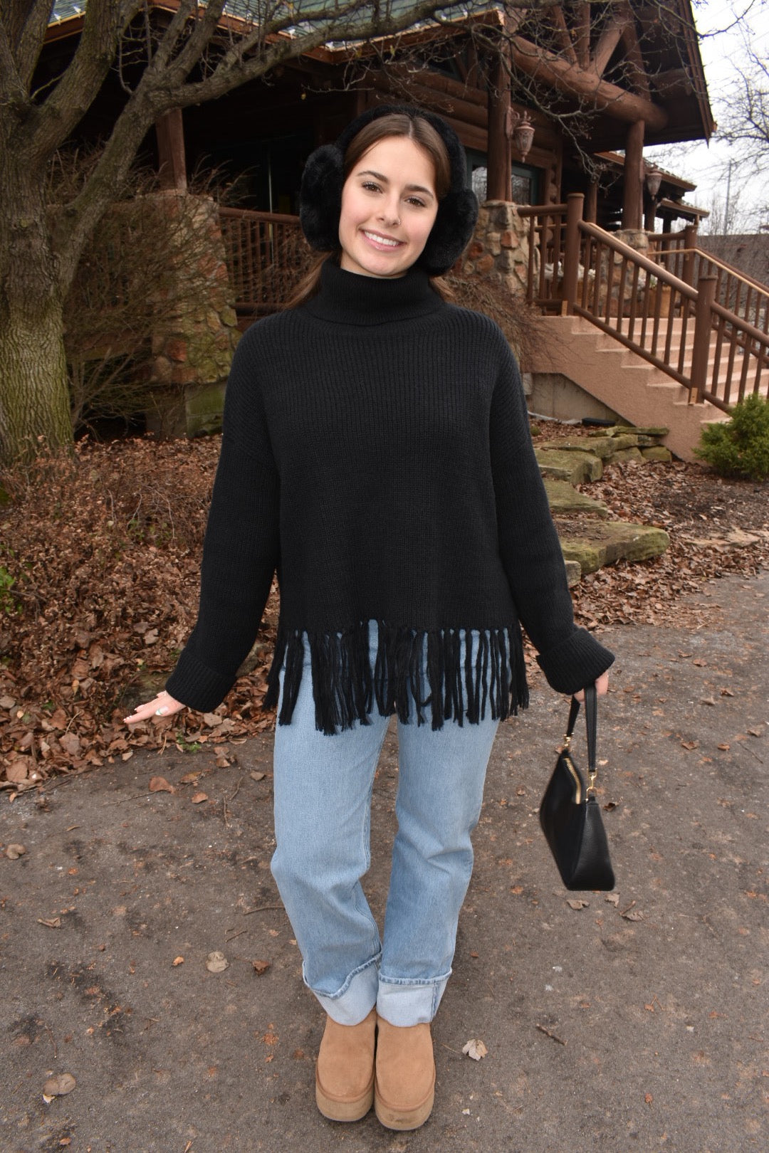 Our "Chalet Fringe Black Sweater" features a turtleneck, dropped shoulders, fringe trim, and an oversized fit.